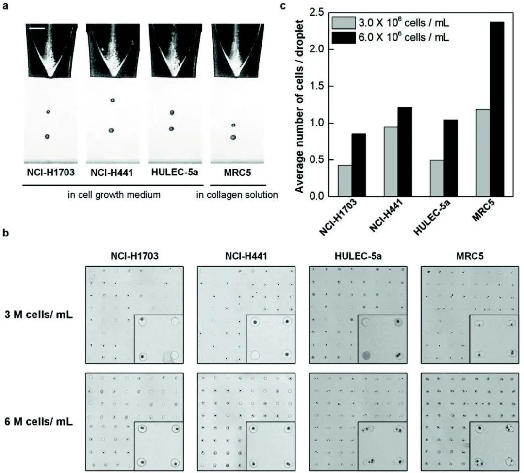 首先,课题组为每种细胞类型开发了可靠的喷墨工艺。NCI-H1703、NCI-H441和HULEC-5a细胞的生物油墨水在细胞生长介质中制备,MRC5细胞被悬浮在稀释的胶原蛋白墨水中。图2a显示了生物墨水的单闪光喷射图像。所有的生物墨水都用80μm大小的压电喷嘴喷射出来,喷射速度为3ms-1。精确调整的双极演化波形和气动压力使细胞液滴具有高分辨率和稳定性的模式。在所有的实验中,其上升、下降和停留时间被设定在10μs左右,峰值驱动电压为±80V。
