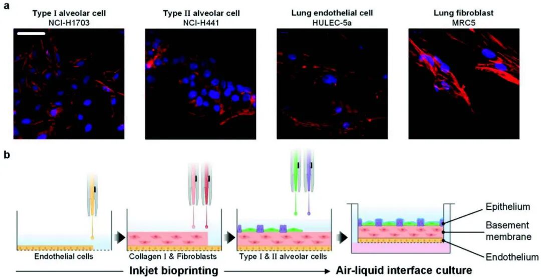 ▲ 图1   肺泡屏障模型的制作。a)鬼笔环肽染色的人肺泡细胞系的共聚焦荧光显微镜图像。肌动蛋白呈红色,细胞核呈蓝色。比例尺:50µm。b)制作肺泡屏障模型的喷墨打印工艺示意图。所有细胞均采用喷墨打印,逐层打印。此图像是使用BioRender创建的。