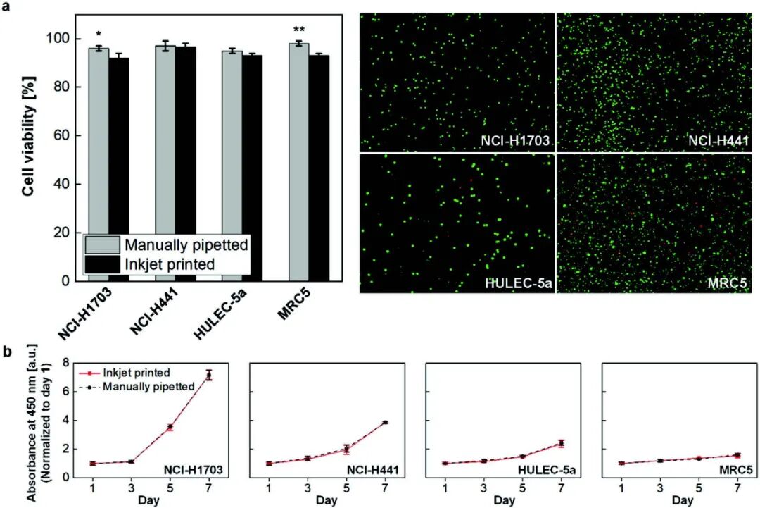 为了研究通过微米大小的喷头喷射对细胞活力和增殖的任何潜在影响,课题组在打印后立即进行了LIVE/DEAD检测和7天的CCK-8检测。图3a显示了通过分析染色钙黄绿素乙酰氧基甲酯(绿色、活细胞)和溴乙啡锭二聚体1(红色、死细胞)的细胞群而获得的细胞活力。结果表明,打印组的细胞存活率高达>90%,接近手动移液对照组的值。在这项研究中,所有人类细胞类型的存活率都很高。图3b显示了打印和对照组在一周内每个细胞系的增殖率。在实验中,打印细胞组跟随着移液器对照组的生长趋势,没有观察到任何明显的细胞死亡,表明喷墨生物打印对正在使用的肺泡细胞没有不利影响。