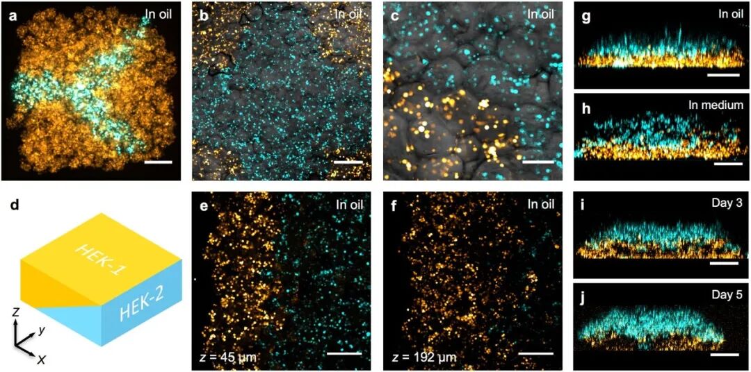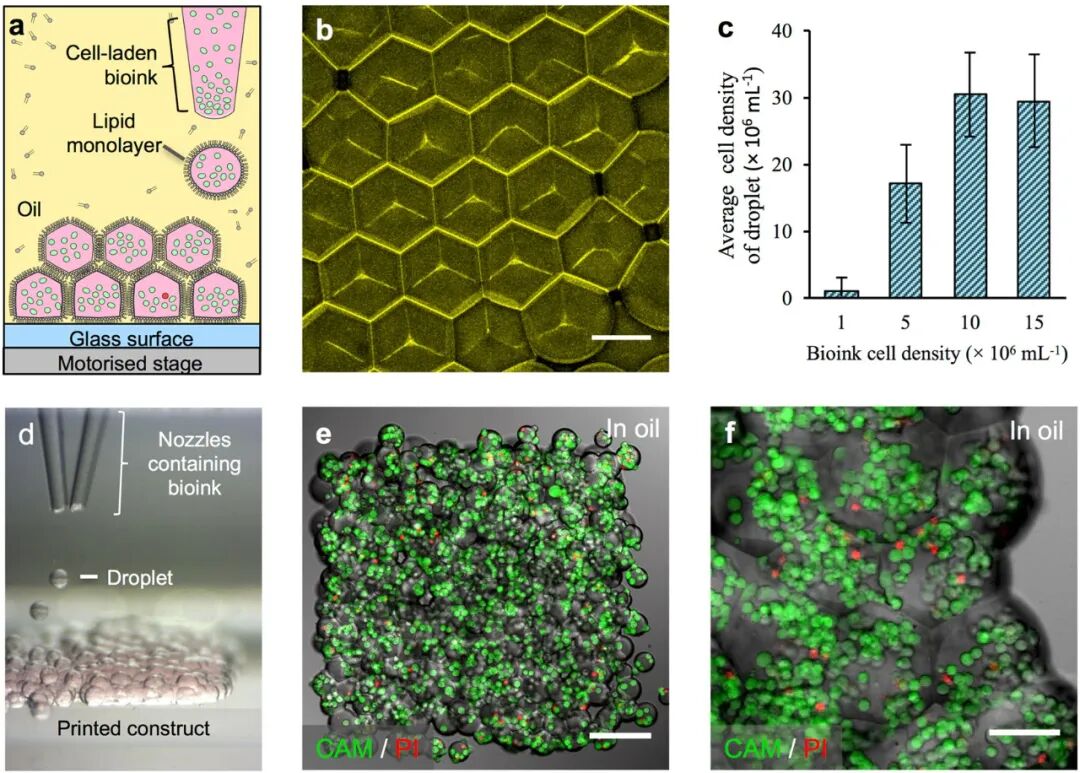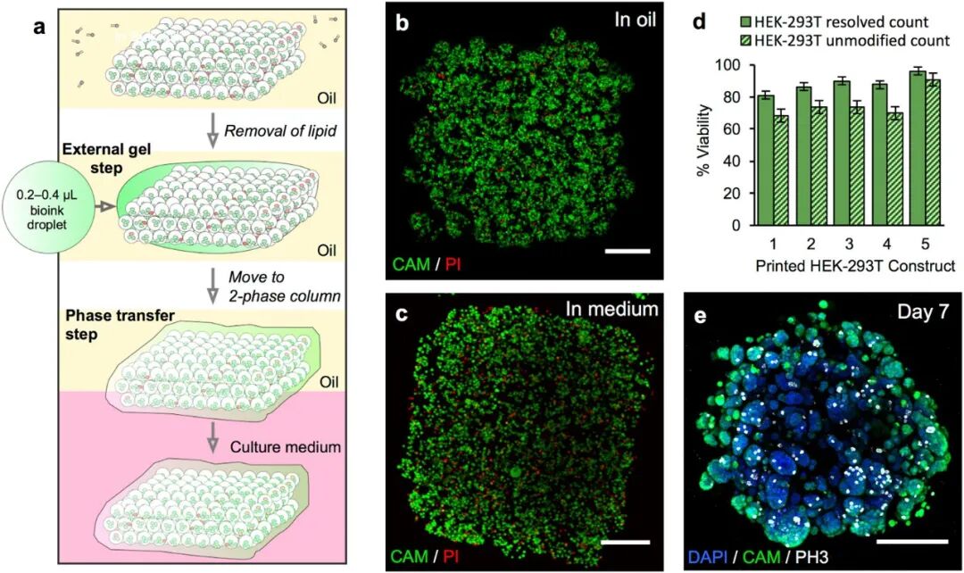 生物打印是一种用于制造活组织的新兴技术,它允许将细胞排列在预定的3D结构中。然而,包含多种细胞类型的高分辨率生物打印结构的例子有限。一种低成本工艺被提出,该工艺采用含有哺乳动物细胞的液滴的3D打印,以在油中产生坚固的、有图案的构造,并将其可重复地转移到培养基中。以组织相关密度(107个细胞/mL) 和1nL的高液滴分辨率。打印出具有≤200μm特征的高分辨率3D几何图形;这些包括一个树枝状细胞连接、一个对角平面连接和一个骨软骨界面。打印的细胞显示出高活力(平均90%),打印结构内的HEK细胞在培养条件下增殖。值得注意的是,一项组织工程研究表明,打印的oMSCs可以沿软骨细胞谱系分化,以产生含有II型胶原蛋白的软骨样结构。